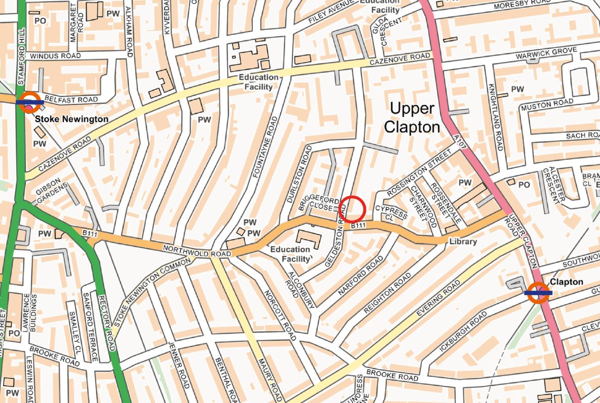 The property is situated in a mixed commercial and residential area, located on Lea Bridge Road (A104). It is close to various amenities, including a supermarket and train station. This ground floor flat includes two bedrooms, a reception room, kitchen, shower, and toilet, along with a front yard and shared rear garden.